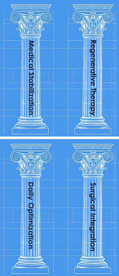 Rather than offering generic solutions or cosmetic fixes, the Blueprint integrates medical stabilization, regenerative therapy, daily optimization, and surgical restoration when appropriate into a unified, individualized plan.